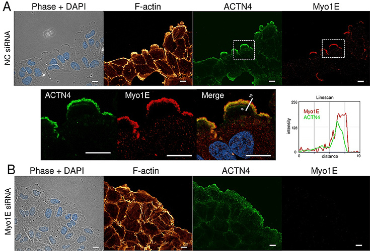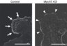 さらに今回、RELの形成と運動に関わる新たな分子として、モータータンパク質「ミオシン-1e(Myo1E)」を同定しました。Myo1Eは、細胞膜とアクチン線維をつなぐことで膜形状を変化させ、細胞の運動を促進する役割を担っていると考えられます。浸潤性肺がん細胞株A549を用いた実験では、Myo1EがRELの先端に局在し、阻害剤の添加やRNA干渉によるノックダウンによりRELの形成と細胞移動が著しく抑制されることが超解像顕微鏡や電子顕微鏡観察などにより確認されました2)。