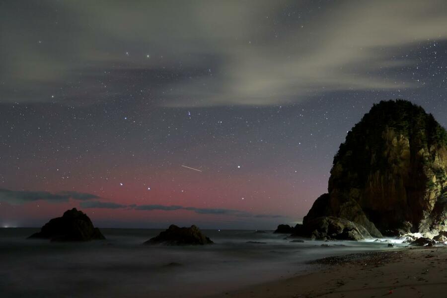 県内で12日夜、オーロラが観測された。新潟日報社が12日午後7時40分ごろ、村上市の景勝地・笹川流れで、赤く染まった北の空の撮影に成功した。