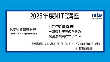 独立行政法人製品評価技術基盤機構【NITE(ナイト)、理事長:長谷川 史彦、本所:東京都渋谷区西原】化学物質管理センターは、2025年12月9日(火)~2026年1月16日(金)(予定)に、「NITE講座2025 化学物質管理 ~基礎と実務のための関連法規制について~」を開催いたします。