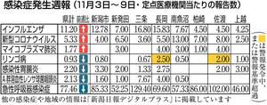 県内13保健所別では魚沼が18・00人と最多で、村上が17・50人、三条が16・80人で続いた。県によると、感染力が強いA香港型が全国的に流行していることなどから、注意報の発令は昨シーズンに比べ約1カ月早いという。