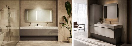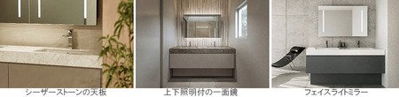 天板、扉柄、ミラー等の組み合わせは豊富なバリエーションの中から自由に選択できるほか、おすすめのコーディネートも複数用意しています。今年2月に発売した「Germoglio キッチン」とカラーバリエーションや天板の素材を揃えることで、住まい全体の一体感を高めます。