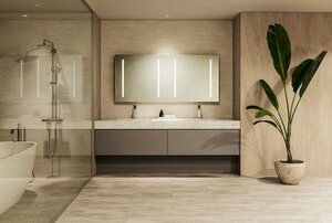 インテリアに馴染むデザイン性と機能性を両立する2タイプのミラーから選択できます。上下照明付の一面鏡は間接照明でやわらかな光を灯し、洗練された空間を演出します。フェイスライトミラーは縦型の照明で顔に影をつくりにくく、メイクやスキンケアの際に自然な明るさで快適に使用できます。