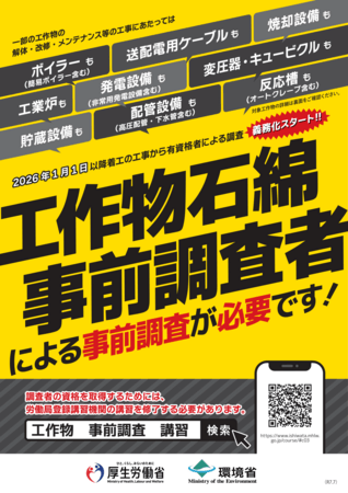 工作物の解体又は改修の作業を行うときは、石綿の使用の有無を調査(事前調査)しなければなりませんが、令和8年1月1日以降、一部の工作物は有資格者(工作物石綿事前調査者)による事前調査の実施が義務付けられます。これを受け、厚生労働省は、令和7年11月13日よりオンライン広告を通じて工作物石綿事前調査者の資格取得を呼び掛けます。
