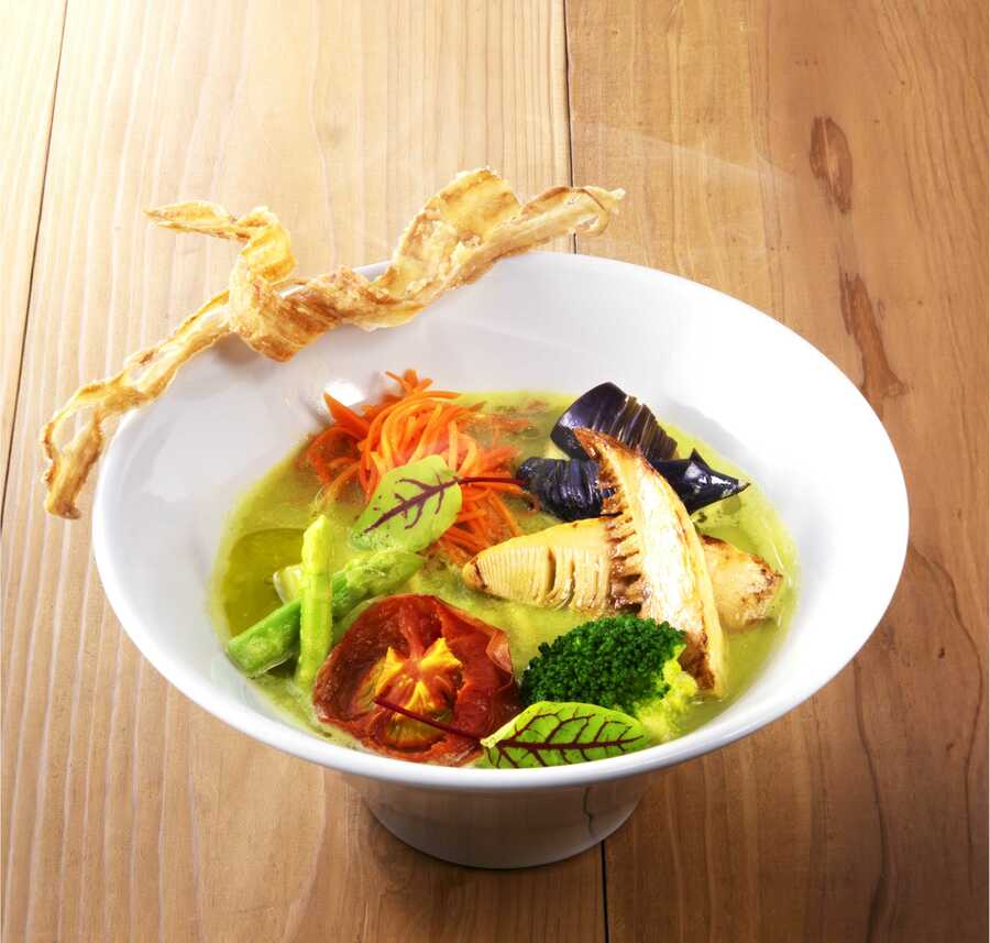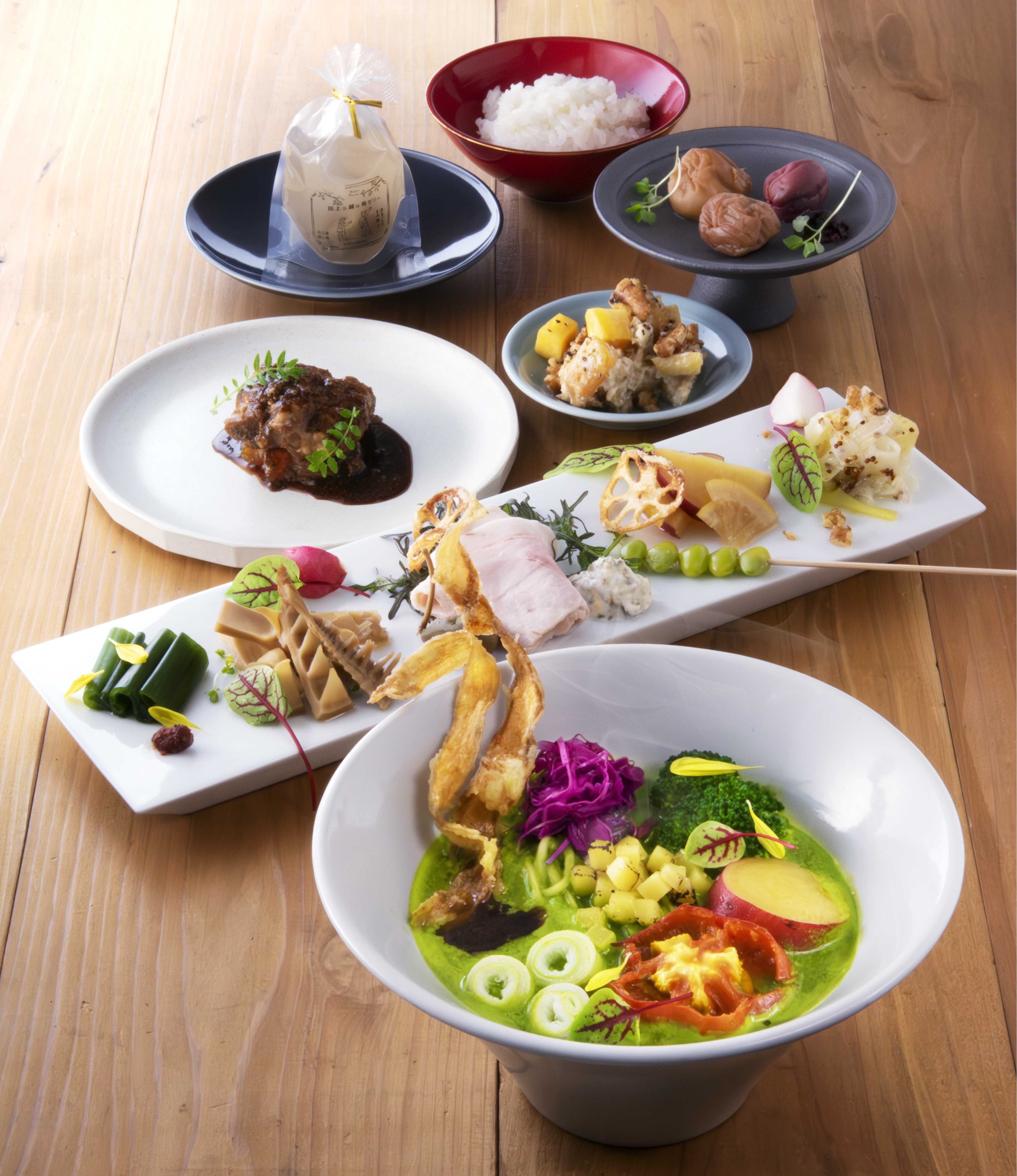 お披露目イベントのコース料理には、名産の筍や護摩堂野菜を中心に、その土地で生産された豚など地域の食材をふんだんに使用します。コースは、富有柿とマスカルポーネチーズを練り胡麻で和えたアミューズでスタート。6種の前菜盛り合わせでは、名産の「がんばるネギ」や筍、「新潟ポーク」、銀杏など地域の魅力的な食材を味わっていただけます。道の駅たがみ内の食堂「たがみ食堂」の梅干し3種食べ比べは、お酒のアテとして、または炊き立ての田上米と一緒にどうぞ。新潟ポークのとろとろ軟骨煮込みは、国産山椒と黒七味をかけてご提供します。メインのラーメンの後には、デザートの「田上の越の梅ゼリー」でさっぱりと。コースはアルコール&ソフトドリンクの飲み放題付きで、特別価格の税込み5,000円でお楽しみいただけます。また当日は「道の駅たがみ」駅長の馬場大輔氏をゲストにお招きし、田上町の魅力や今回の料理へのこだわりについて語っていただきます。