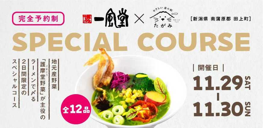 株式会社力の源ホールディングス(本社:福岡市中央区、代表取締役社長:山根智之)傘下の力の源カンパニーが運営する博多発祥のラーメン店「一風堂」は、道の駅たがみ協同組合(所在地:新潟県南蒲原郡田上町、理事長:野澤幸司)とコラボレーションし、田上町の食の魅力を広く伝えるため、田上町名産の「護摩堂野菜」を使用したラーメンを共同開発しました。そのお披露目会として2025年11月29日(土)と30日(日)の2日間、東京都港区「一風堂 浜松町スタンド」にて特別なコース料理を味わえる予約制イベントを開催します。今回のコラボレーションの橋渡し役となったのは、地域密着で販路開拓、観光振興に努める株式会社ブリッジにいがた(本社:新潟県新潟市、代表取締役社長:小栁徹)です。