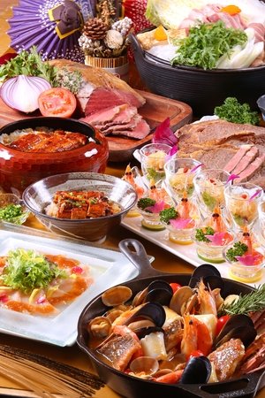 本日の前菜(紅白なます/柚子伊達巻/有頭海老の美味塩漬け/黒豆/栗きんとんなど)/サラダバー/アシェットシャルキュトリー/マグロのカルパッチョ/塩水蝦/パテ ド プーレ/フカヒレスープ/サーモンのロースト 山椒香るフレンチソース/白煮魚のポルテュゲーズ/トラディショナルブイヤベース(ディナー限定)/鴨のロースト オレンジソース/牛すき鍋/ジャンボエビフライ/ 里芋のベジタブル餡かけ/翡翠餃子のクリーム煮/桃饅頭/本日のパスタ2種/お餅と明太子のピザ/鰻のひつまぶし風茶漬け/ホテルメイドカレー/フルーツ/デザート各種/アイス各種/ソフトクリーム etc.