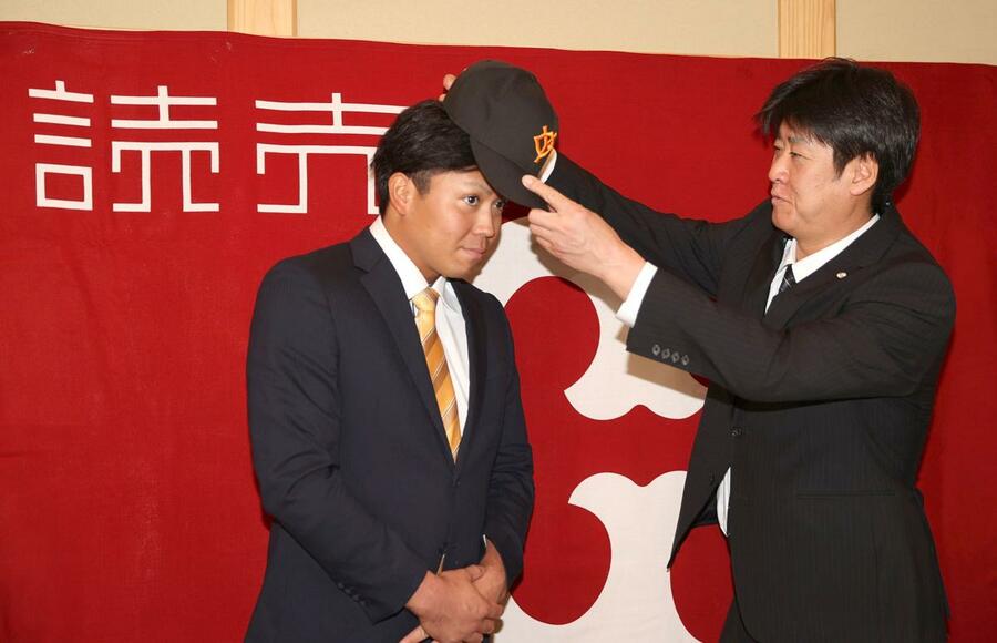 仮契約に緊張の面持ちで臨んだ知念。その後の会見では「ジャイアンツ優勝のため、少しでも力になれるよう必死に頑張っていく」と表情を引き締めた。