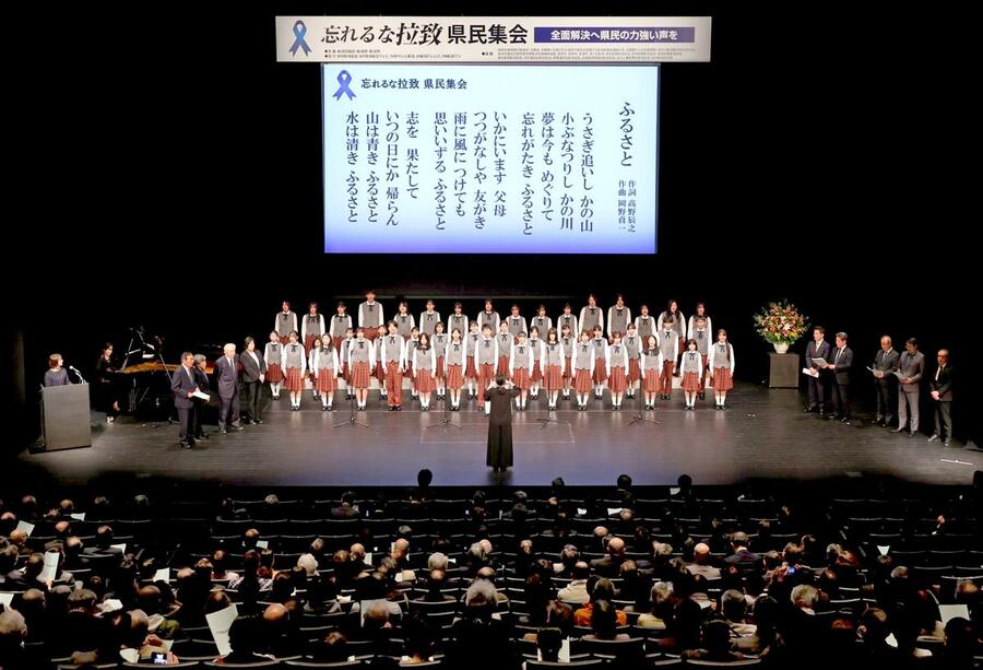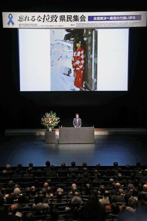 新潟市で横田めぐみさん=失踪当時(13)=が北朝鮮に拉致されてから48年となった15日、拉致被害者らの早期帰国と問題の全面解決を訴える「忘れるな拉致 県民集会」が、新潟市中央区の市民芸術文化会館で開かれた。中継で参加しためぐみさんの母早紀江さん(89)は「これからの子どもたちを守るためにも、みんなで力を合わせて(拉致問題を)解決していただきたい」と協力を呼びかけた。