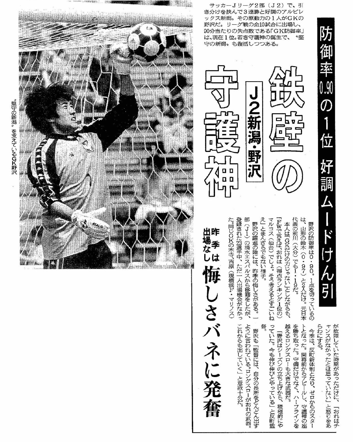 「野沢(当時の表記)の好守」「好セーブ」と、当時の記事には試合のたびに活躍が載った。一気にチームの主力へと成長した野澤だったが、第41節の京都戦、J1昇格が絶望的となる相手の得点を許したのも21歳のGKだった。
