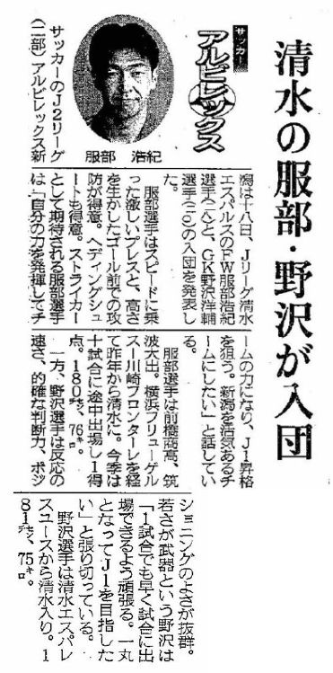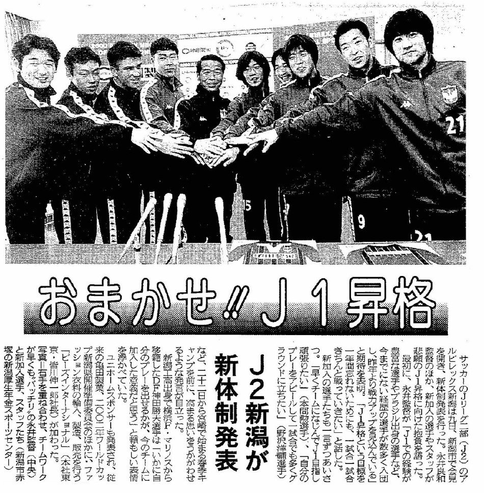 2002年のワールドカップ開催を控え、至上命令のJ1昇格に向けて年末に10人を解雇したばかり。永井良和監督の下、経験豊富な攻撃陣を中心に9人が加入した。服部のほか、寺川能人(現強化本部長)、本間勲(現コーチ)も入団同期。地元出身の元日本代表DF神田勝夫も加入し、この年の補強は間違いなく新潟の未来につながるものだった。