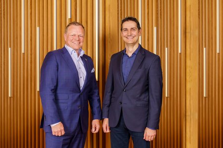 シェフラー E-モビリティ事業部CEOのトーマス・シュターレ(写真左)とonsemi CEOのハッサーン・エルコーリー氏(同右)