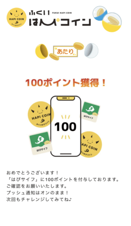 期間中、「はぴくじ」に挑戦できるプッシュ通知が届き、抽選に当選すると最大500円分の「ふくいはぴコイン」が付与されます。