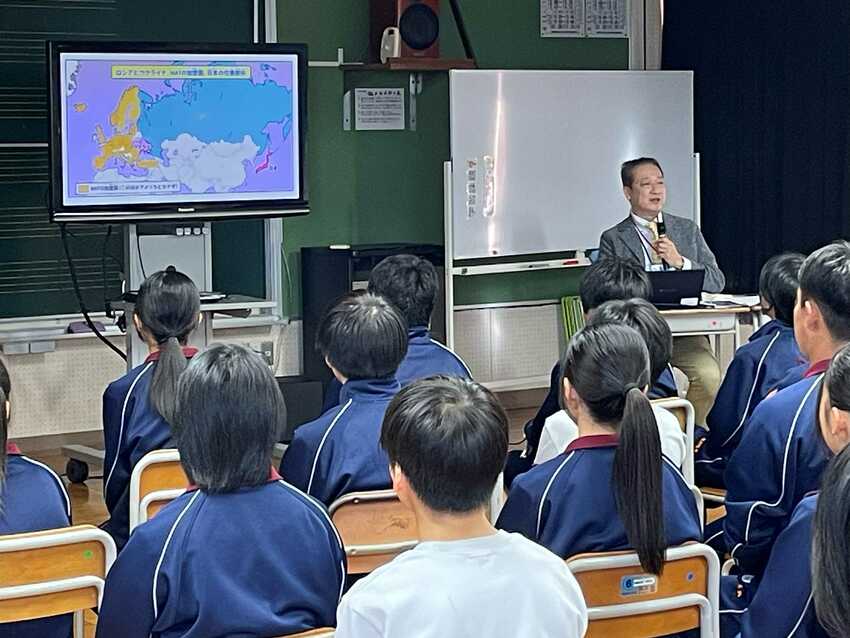 ロシアとウクライナの戦争で亡くなった人の数や民間人の被害者数、実際の画像、ロシアに連れ去られたと考えられる子どもの数等具体的な話に、特に3年生の生徒の皆さんが興味をもって聞き入る姿が大変印象的でした。
