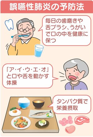 今回は誤嚥(ごえん)性肺炎の「味方」についてです。誤嚥性肺炎とは、本来食道へ入るはずの食べ物や唾液、口の中の細菌などが誤って気道に入り、肺に炎症を起こす病気です。高齢者に多く、再発を繰り返すことで命に関わることもあります。原因には、かむ・のみ込む力の衰え(嚥下(えんげ)障害)や口の筋肉や感覚が弱まる「オーラルフレイル」、脳卒中、認知症、パーキンソン病、糖尿病などの基礎疾患が関係します。