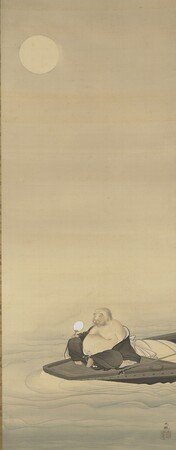 布袋は七福神のひとりで、 金運、家庭円満、健康などのご利益をもたらす神様として広く信仰されています。 本作では、満月と、それを水に浮かべた船でくつろぎながら愛でる布袋が描かれています。月と布袋の間には漠然とした空間が広がり、淡い地塗りがほどこされています。これが観る者に想像の余地を与えると同時に、空気、光の存在を表しており、「朦朧体」と呼ばれた表現の試みとみることができます。ガラスケースなしの床の間でぜひじっくりとご鑑賞ください。