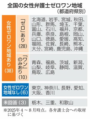 全国の地方裁判所の支部管内に事務所を置く女性弁護士が0人か1人の地域(ゼロワン地域男女を問わず、管内に登録する弁護士が1人以下(0か1)の地域。地方裁判所の本庁は北海道に四つと46都府県に各一つの計50、支部は203あり、日弁連は管内の弁護士が0人の「ゼロ地域」と、1人の「ワン地域」を合わせてゼロワン地域と呼んで解消に取り組んできた。(※ページ中ほどに詳細))が、今年4〜8月時点で、全203支部のうち少なくとも38道府県の102支部あることが16日、共同通信の調査で分かった。約5割に当たり、女性弁護士の絶対数が少ない中、特に地方で不足している現状が浮き彫りになった。女性同士でなければ相談しづらい性被害やドメスティックバイオレンス(DV)などの事案に対応できていない可能性がある。