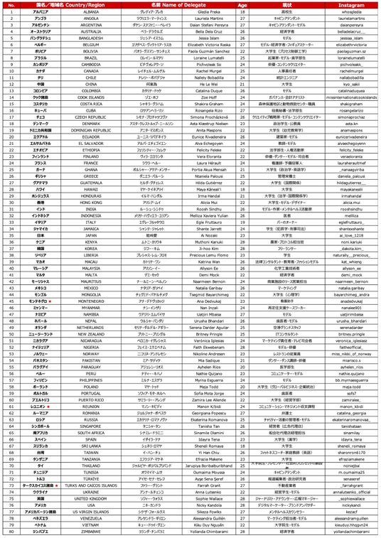今年は80※の国と地域から“美と平和の親善大使”の出場が決定しました。 そのうち、モンテネグロ、レユニオン、タークス・カイコス諸島の3カ国・地域が初出場を果たします。代表者たちは11月12日(水)より来日し、約2週間にわたり日本各地で社会貢献・文化交流活動を展開します。 これらの活動は大会審査の一環でもあり、“外見の美しさ”だけでなく、思いやりや知性に裏づけられた“心の美しさ”が問われます。