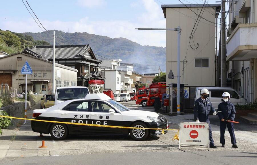 大分市佐賀関の大規模火災現場周辺に張られた規制線=19日午前11時前