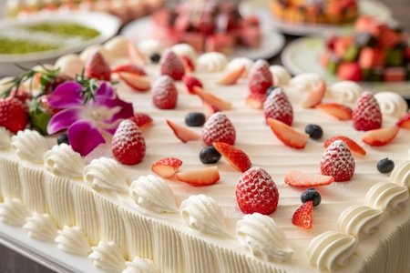 しっとりとしたスポンジ生地に口どけなめらかな生クリームをたっぷりと使用したパティシエ手作りのジャンボショートケーキ。