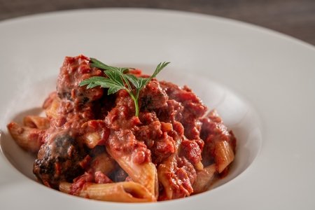 ほろっと崩れるミートボールとペンネを、赤ワイン香るトマトクリームソースで絡めた濃厚パスタ。