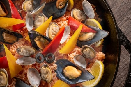 海の幸たっぷりのトマト風味のパエリア。旨味がぎゅっと詰まった一品です。