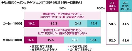 【地域限定クーポンが配布されたら、秋の”お出かけ”(行楽)に前向きになる】では、『あてはまる(計)』は58.5%、『あてはまらない(計)』は41.5%となりました。