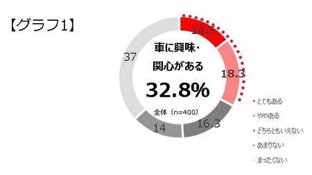 20代男女400人に自動車に対する価値観や、走りに対する意識について調査したところ、「車に興味・関心がある」人はわずか32.8%。