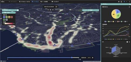 車両の走行データや人流データを用いて神戸市垂水地区の渋滞状況を再現しています。