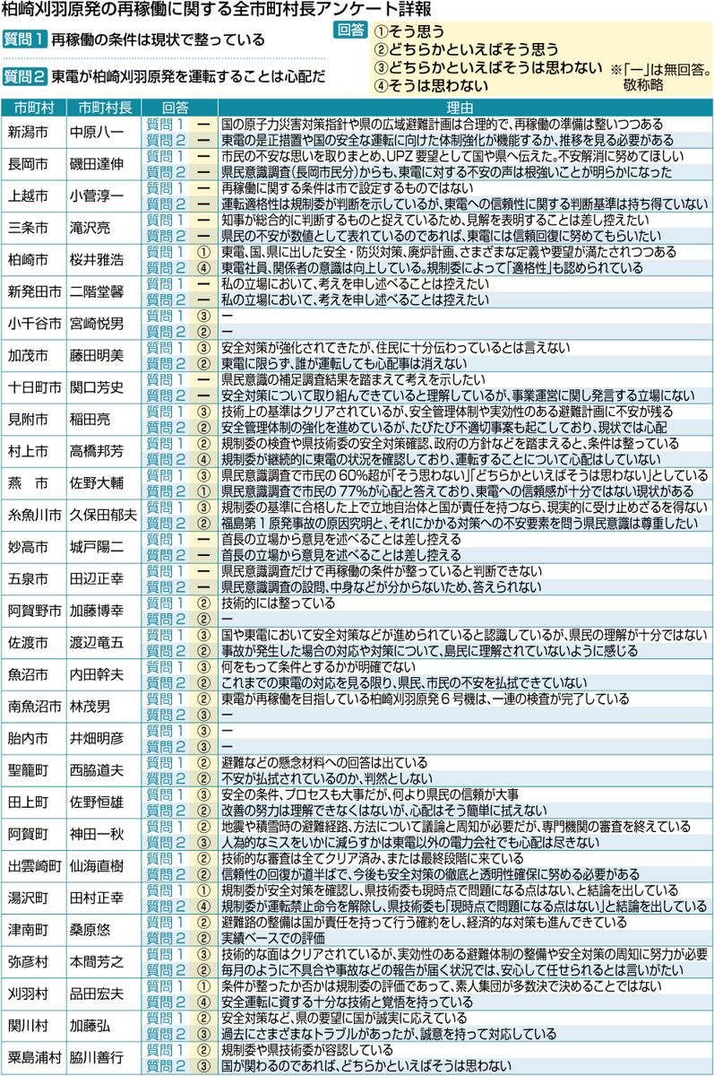 新潟日報社は東京電力柏崎刈羽原発の再稼働問題に関し、県内の全30市町村長にアンケート調査を行った。再稼働の条件が現状で整っているかについては、「そう思う」(3人)と「どちらかといえばそう思う」(9人)の肯定的な回答が計12人で、「どちらかといえばそう思わない」の否定的回答の10人を上回った。県が行った県民意識調査での同じ質問では、否定的回答が6割に上っており、県民との認識のずれが表れた格好だ。