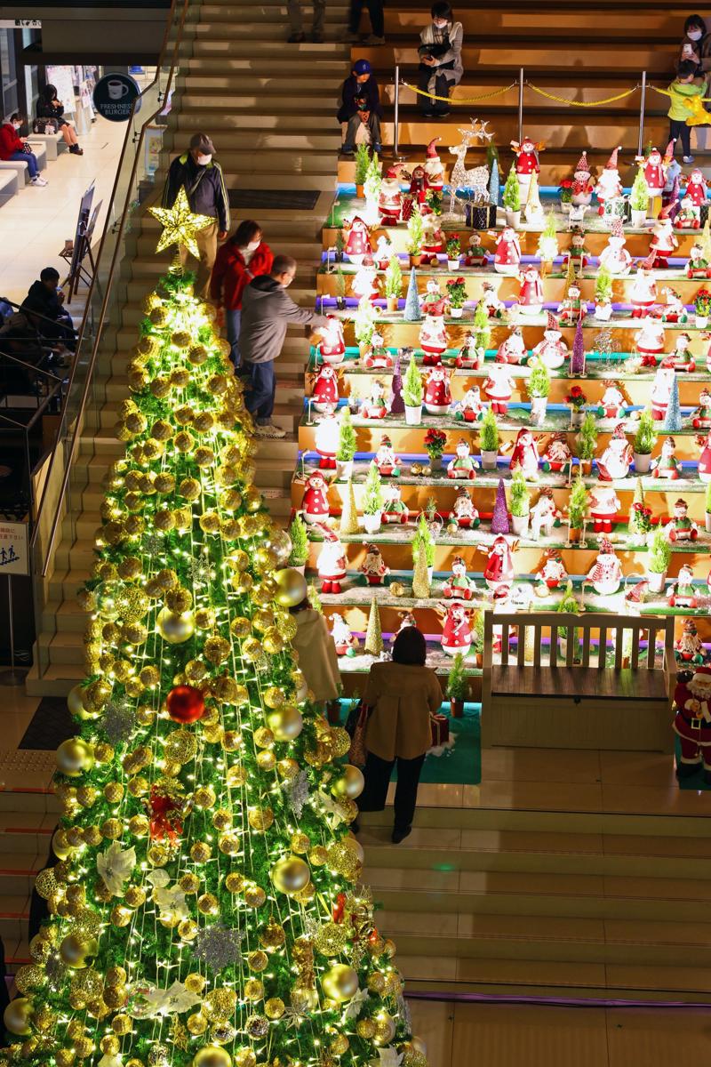 付近の階段には100体のサンタクロースとスノーマンが並ぶ。