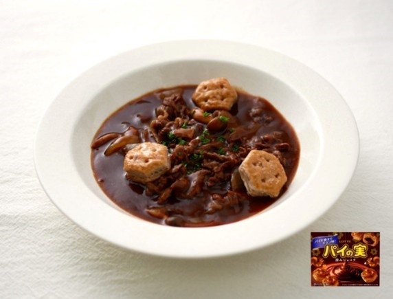 パイの実のサクサクの食感を活かし、オートクッカーで仕上げたハッシュドビーフにのせて楽しむレシピ。仕上げに電子レンジで軽く温めると、中のチョコレートが溶け出し、食卓にひと味違うごちそう感を演出します。