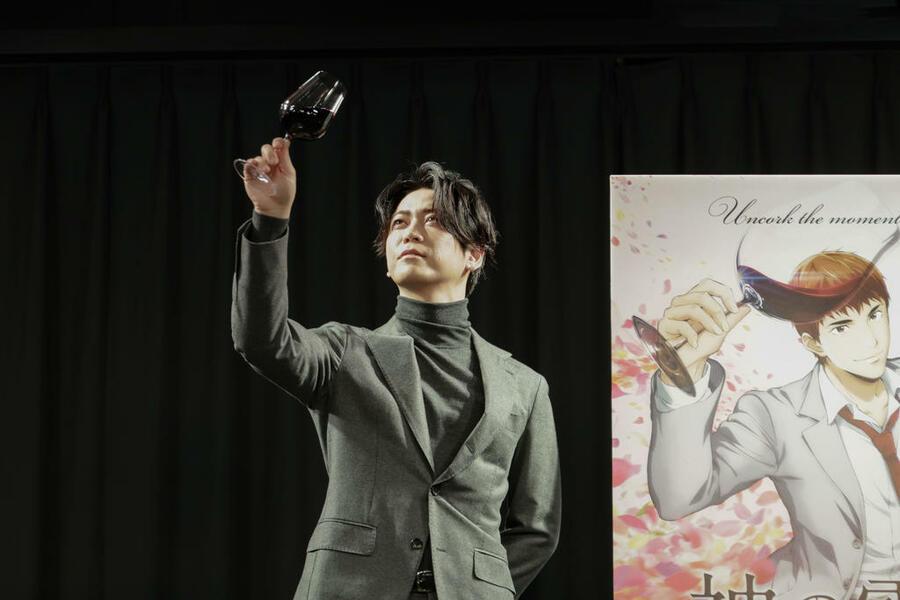 発表会では糸曽教授と、声優として主人公・神咲雫を再び演じる亀梨氏が並んで登壇。アフレコ時のエピソードなどが語られました。当日はフランス本国のボージョレヌーボーの解禁日でもあり、糸曽教授と亀梨氏がワインを掲げてフォトセッションに臨む場面も見られました。