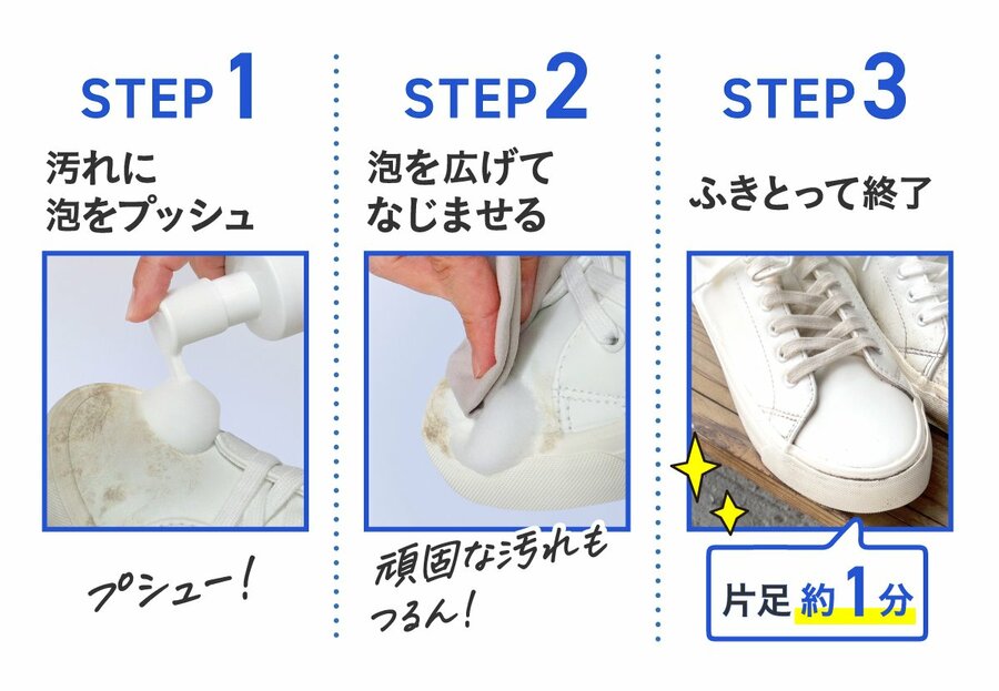 本製品は、靴用クリーナーとして日本で初めて「F5Tジェットフォーマー」を採用。強力なジェット泡が「シューーッ」と勢いよくピンポイントにスニーカーの細かなミゾの奥まで届き、黒ずみやガンコな泥・油汚れを浮かせます。水洗い不要で、クロスで拭き取るだけの手軽さですばやく汚れを落とします。さらに消臭*&除菌*&コーティング成分配合で、お出かけ前でも大切なスニーカーのお手入れが完了します。
