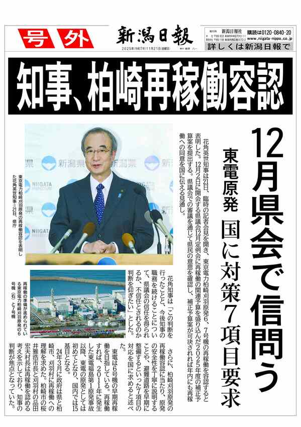 【号外】新潟県知事が柏崎刈羽原発再稼働を容認 2025/11/21 17:00 (最終更新: 2025/11/21 17:17) PDFで号外を見る 会見のテキスト速報はこちら>> 原発問題関連ニュースはこちら>> トップページで最新情報を見る 関連ニュース 【速報】柏崎刈羽原発再稼働を容認、新潟県の花角英世知事が表明... 16:00 【再稼働問題テキスト速報】柏崎刈羽原発の今後は…新潟県の花角... 10:25 【柏崎刈羽原発再稼働問題】登庁した花角知事の様子は…?会見は... 9:10 【柏崎刈羽原発テロ対策不備】再稼働の“最終局面”で不祥事露見... 11/20 柏崎刈羽原発再稼働、新潟県内全30市町村長は肯定的?否定的?... 11/20 柏崎刈羽原発再稼働を容認へ…花角英世知事がきょうにも表明 県... 11/20 【柏崎刈羽原発再稼働問題】都議会自民党、小池百合子都知事の視... 11/20 柏崎刈羽原発でまたテロ対策不備、秘密文書を不適切コピー・原子... 11/20 柏崎刈羽原発再稼働、県議53人の考えは?[新潟日報社アンケー... 11/20 【柏崎刈羽原発再稼働問題】柏崎市の桜井市長「6号機再稼働に理... 11/19 福島第1原発視察の花角英世知事「事故の影響実感」 柏崎刈羽原... 11/19 【柏崎原発再稼働どう思いますか?】大火から復興、県最西端の街... 11/19