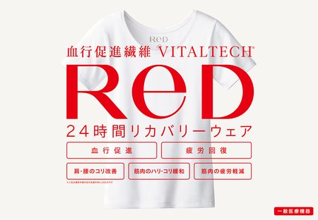 ReD は⾎⾏から毎⽇を元気にする、24 時間リカバリーウェアです。8 つの天然鉱⽯を独⾃配合した⾎⾏促進繊維VITALTECH®が⾝体から放出される遠⾚外線を吸収し、再び肌へ放出することで⾎⾏を促進。「⾎⾏促進」と「疲労回復」という2 ⼤効果で、健康で美しく⽣き⽣きとした⼈⽣=VITAL LIFE を応援します。