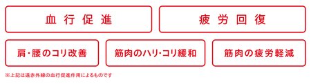 一般医療機器区分「家庭用遠赤外線血行促進用衣」として、「血行促進」「疲労回復」「肩・腰のコリ改善」「筋肉のハリ・コリ緩和」「筋肉の疲労軽減」の5つの効果が期待できます。