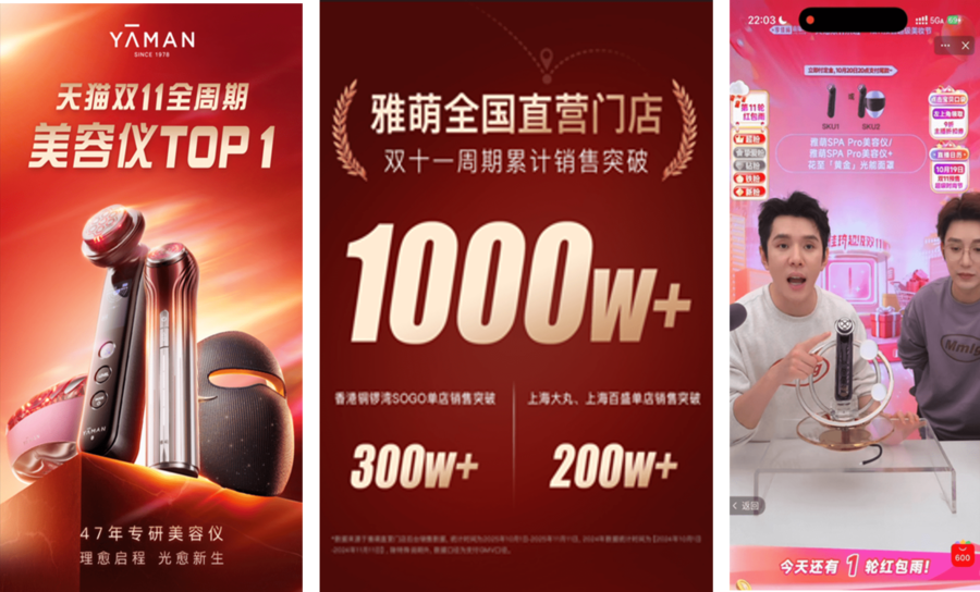 「美しくを、変えていく。」をスローガンに掲げ、技術の力でグローバルに美の進化に挑み続ける5年連続美顔器シェアNO.1*²のヤーマン株式会社(所在地:東京都江東区、代表取締役社長:山﨑貴三代)は、世界最大規模のネットセールス期間として知られる「独身の日」において、中国最大の総合ECプラットフォーム「Tmall」内の美容機器部門の販売実績で昨年に続き1位*¹を獲得しました。また、中国国内で代理店が運営しているヤーマンブランドの店舗における独身の日期間を含む売上が、1,000万元*³を突破しました。