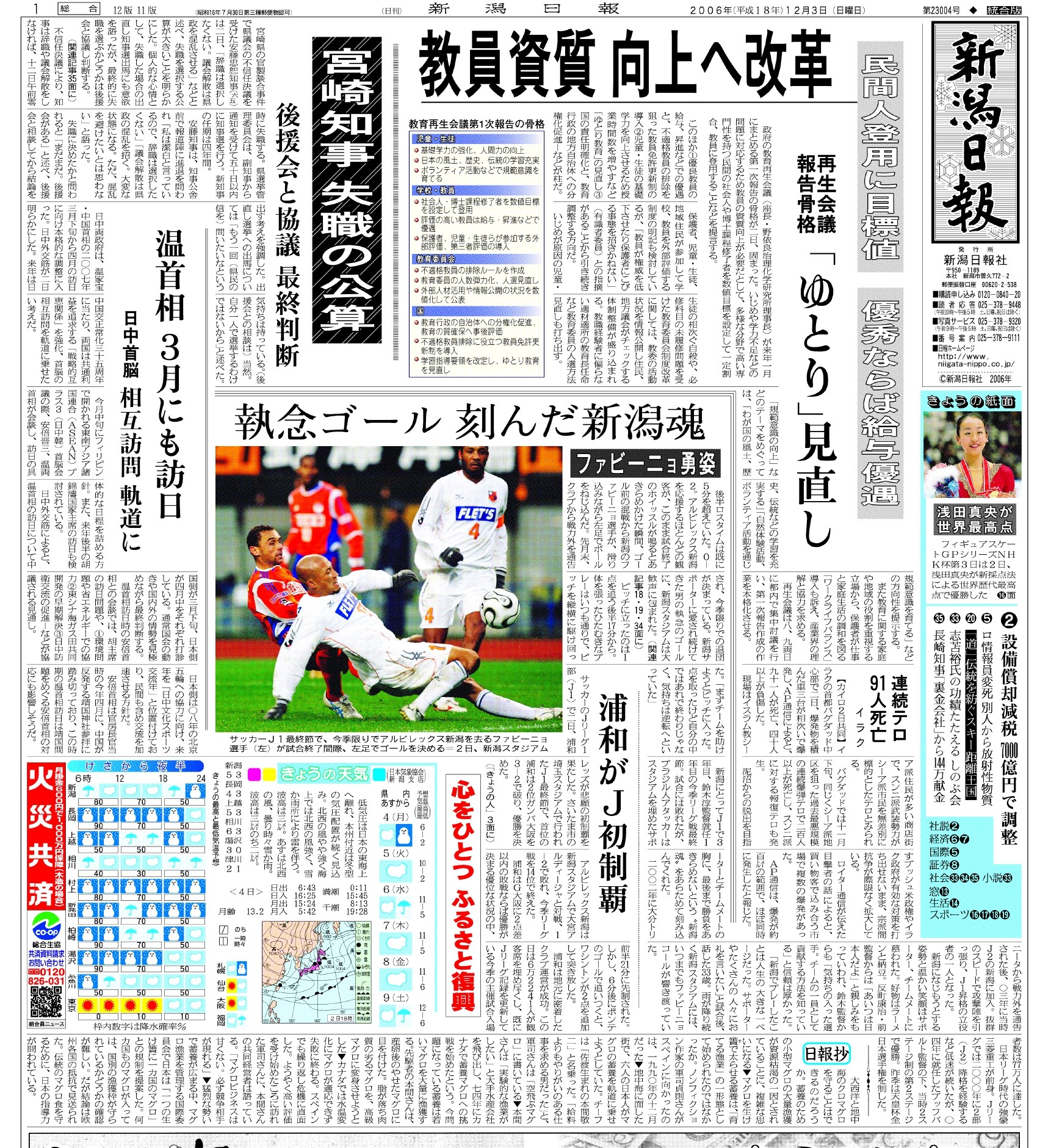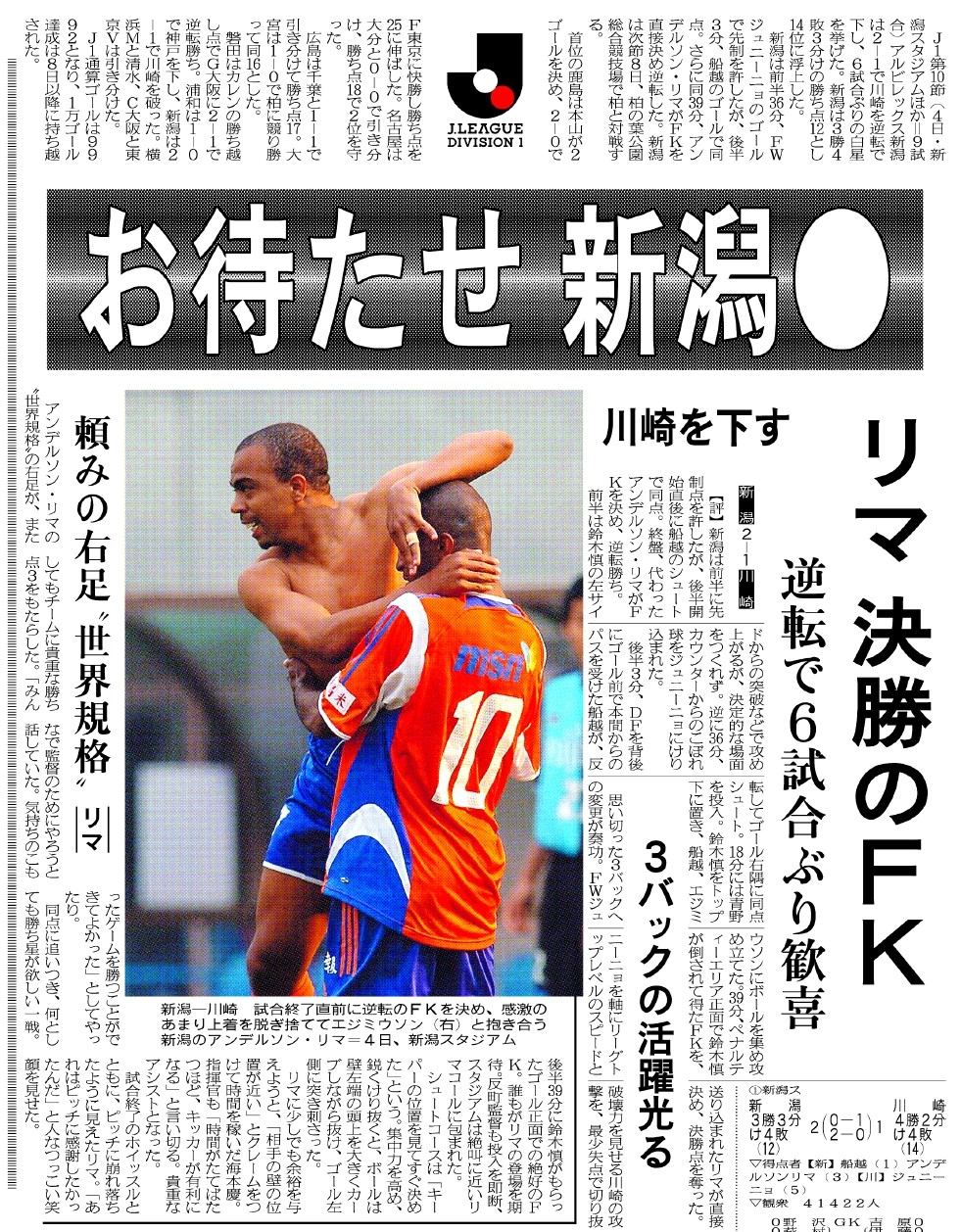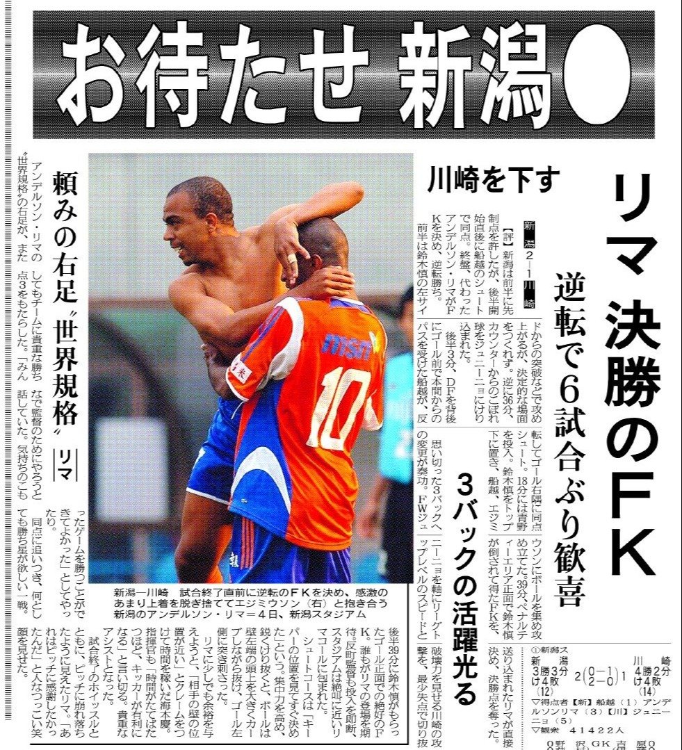 ファビーニョがどれくらい特別な存在だったか。それを表す一例として、当時の新潟日報は「お別れゴール」を一面の真ん中で伝えました。