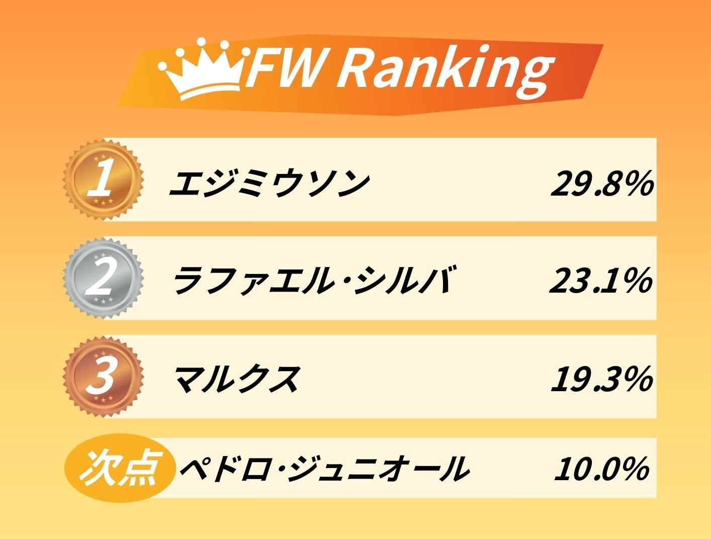 3人が飛び抜けていて、文句なしといった感じでしょうか。続いて激戦区のFW部門です。