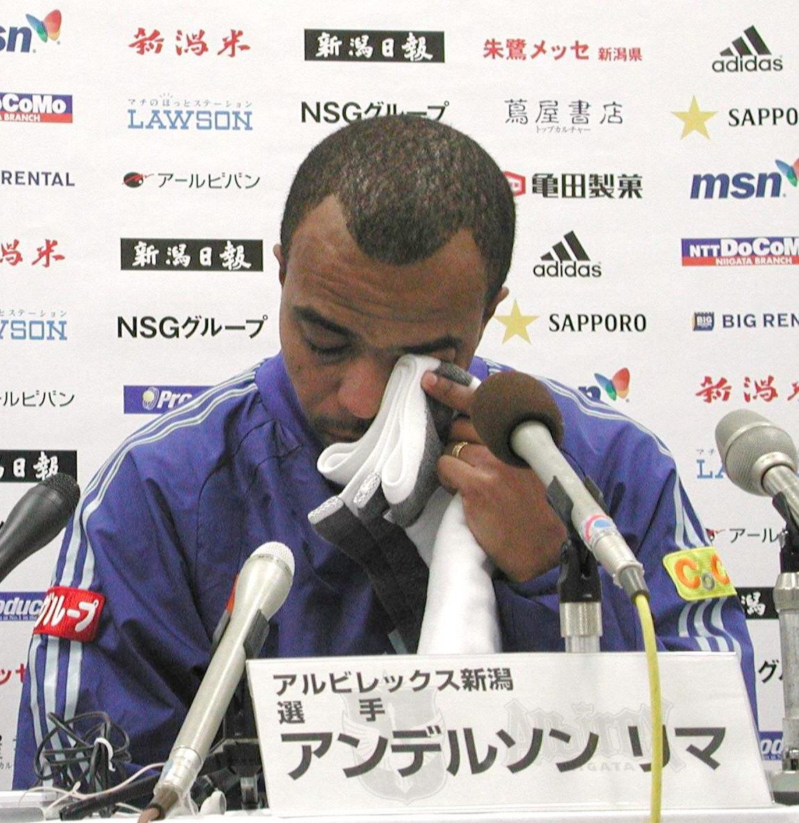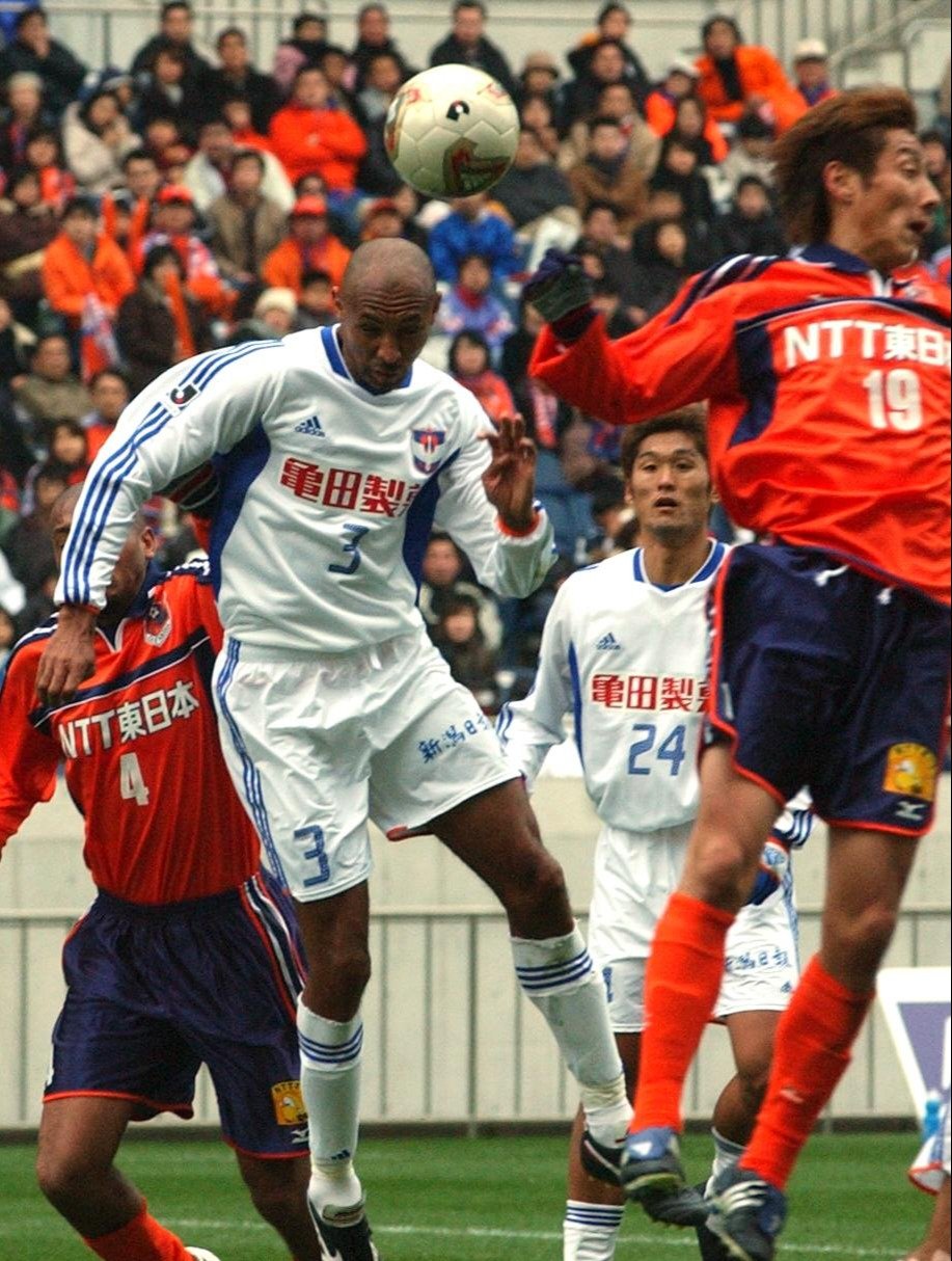 この写真は2003年の開幕戦。初のJ1昇格を決めたシーズンはアンデルソンのヘディング弾で幕を開けました。セルジオが退団し、入れ替わるようにアンデルソンの加入が決定。3月9日に来日、10日にキャンプ合流、そして16日の開幕戦でこの活躍というドタバタぶりでした。192センチの長身で「2代目越後の壁」でもあり、「越後山脈。圧倒的な高さで沈めた2003ファーストゴールは忘れない」(32歳男性)というコメントがあります。