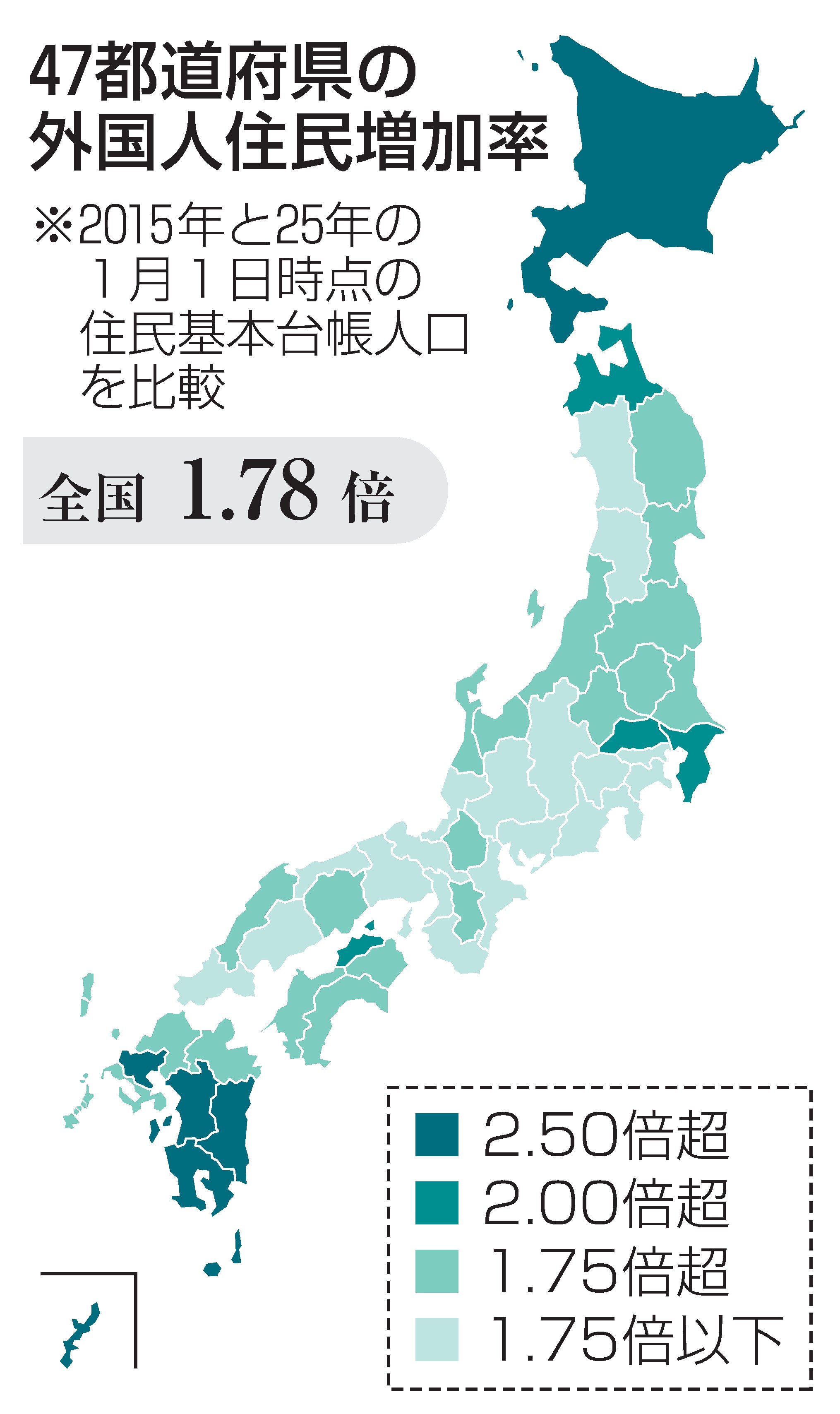 留学生の定着を促し、高度人材として育成する支援策も一部に見られる。大都市圏に転出しないよう、つなぎ留められるかどうかが課題となる。外国人住民の増加は47都道府県の全てで見られ、全国合計は10年前と比べ1・78倍だった。