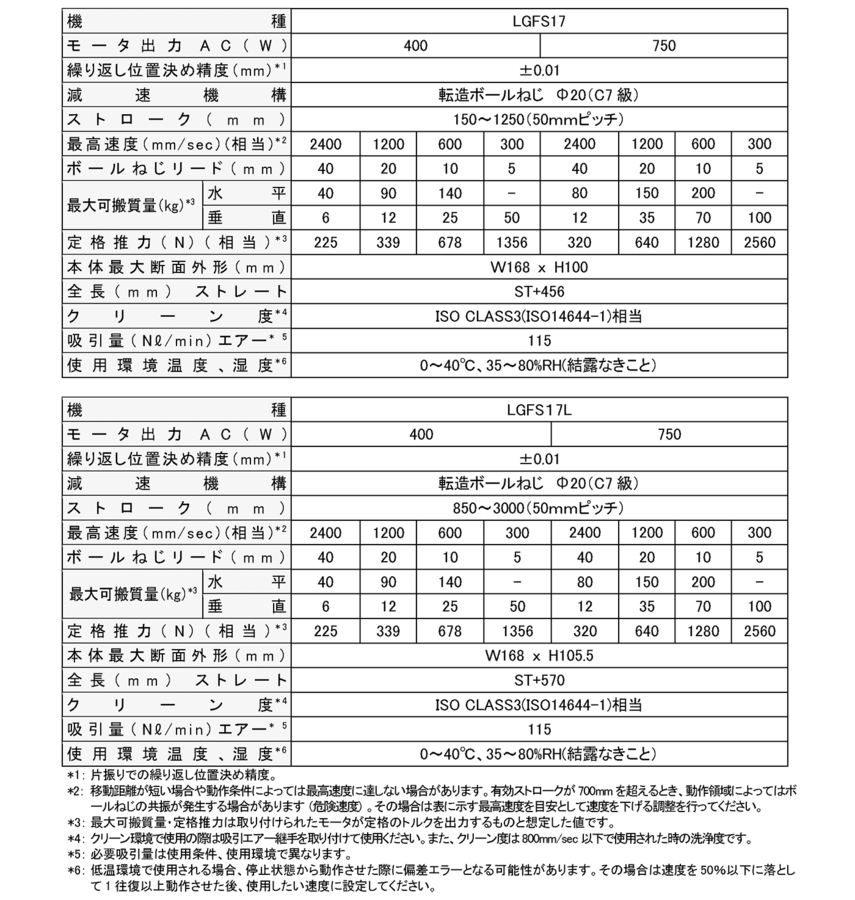 薄型化しながらも、従来機比でピッチング方向、ヨーイング方向、ローリング方向いずれも剛性が約2倍に向上。繰り返し位置決め精度は±0.005mm、走り精度が ±0.02/800mmと高精度を誇ります。