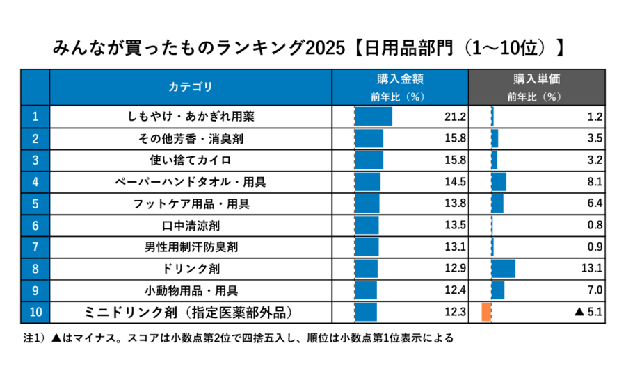 日用品部門の第1位は「しもやけ・あかぎれ用薬」で前年比21.2%増、