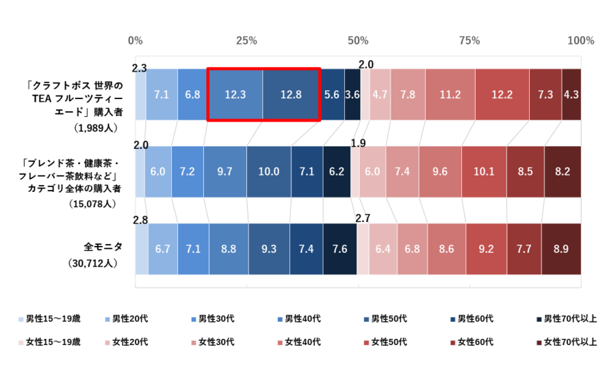 8位の「ブレンド茶・健康茶・フレーバー茶飲料など」(※3)は、ロングセラー商品である日本コカ・コーラ「爽健美茶」やアサヒ飲料「アサヒ 十六茶」などのほか、今年3月に新発売されたサントリー「クラフトボス 世界のTEA フルーツティーエード」も上位にランクインしました。【図表1】 また、同カテゴリは無糖茶の商品を多く含み、カテゴリ全体では女性の購入比率が高くなっています。そのカテゴリに含まれる「クラフトボス 世界のTEA フルーツティーエード」は、40~50代からの支持が高く、特に男性40~50代の購入率が高いことが特徴的です。【図表4】