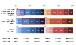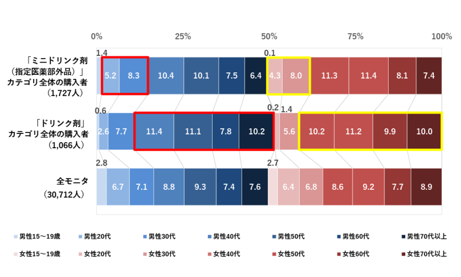 「ドリンク剤」と「ミニドリンク剤(指定医薬部外品)」のカテゴリの購入者について、性年代比率を見ていきます。「ドリンク剤」は男女ともに40代以上の割合が高く、「ドリンク剤」に比べて「ミニドリンク剤(指定医薬部外品)」は男女ともに20~30代の購入が活発でした。【図表7】 「ミニドリンク剤(指定医薬部外品)」は、平均単価が前年から5.1%減少し【図表6】、1人あたりの購入金額は上昇していることから(※6)、低価格の商品を数多く(頻度高く)購入している様子がうかがえます。
