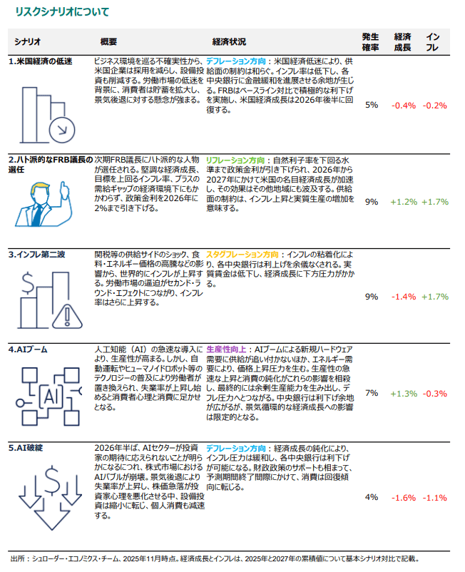 基本シナリオ以外で最も可能性の高いリスクシナリオとして、「ハト派的なFRB議長の選任」 と「インフレ第二波」を想定しています。「ハト派的なFRB議長の選任」では、堅調な経済環境にもかかわらずFRBが政策金利を2026年に2%まで引き下げることで、リフレーション圧力がかかることを想定しています。また、「インフレ第二波」については、関税の影響や食料・エネルギー価格の高騰によりインフレが加速、賃金上昇を通じてさらなるインフレ圧力を招くことで、経 済成長は鈍化するというスタグフレーション方向のシナリオを想定しています。