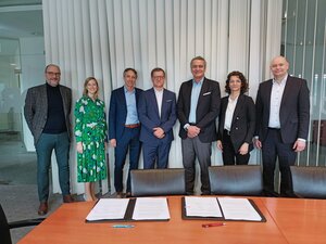 ライセンス契約書への署名(左から右へ):Andritzコマーシャルセールス部門ディレクター Matthias Hoetzl 氏、Andritz法務顧問 Katharina Sandriesser氏、 Andritzプロポーザル&ビジネスディベロップメント部門バイスプレジデント Dr. Klaus Bärnthaler氏、 Andritz取締役 Dietmar Heinisser氏、BASF化学品中間体事業本部欧州担当シニア・バイスプレジデント ヴァシリオス・ ガラノス、BASF OASE技術マーケティングマネージャー ハミデ・アヒ、BASF OASEグローバルコマーシャルマネジメント 担当 グレン・ラングート