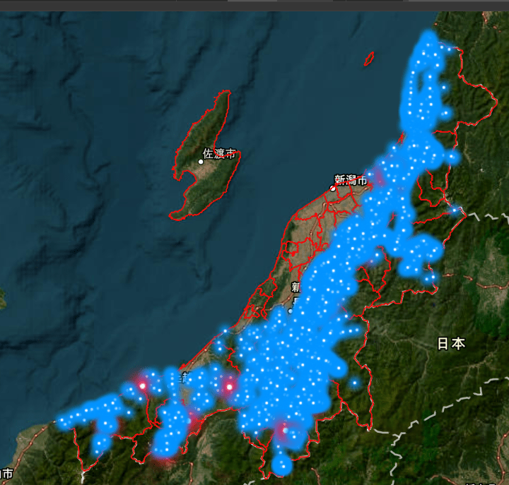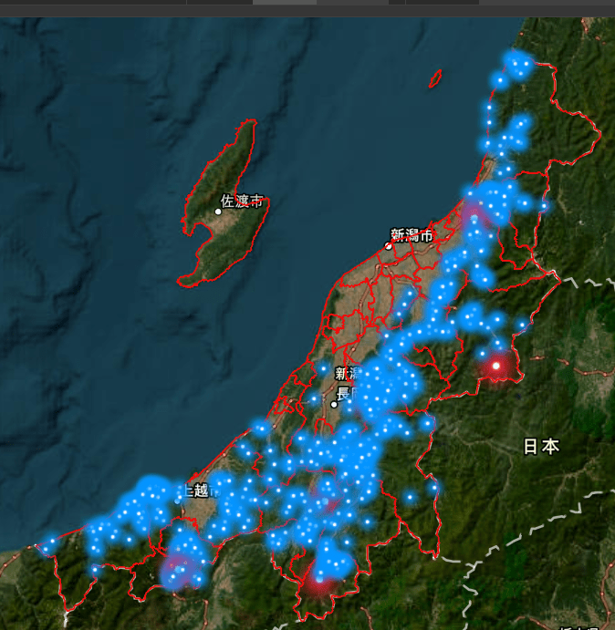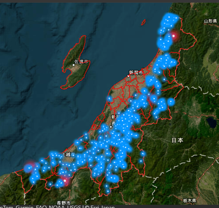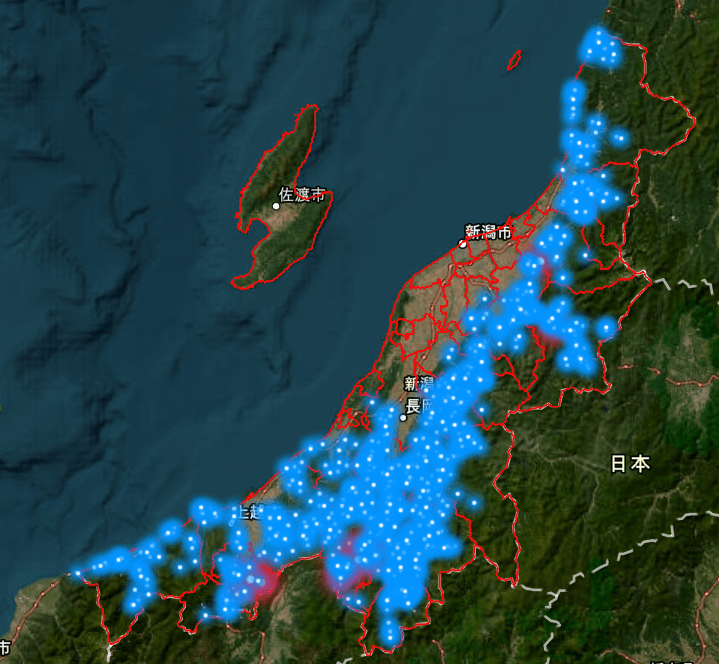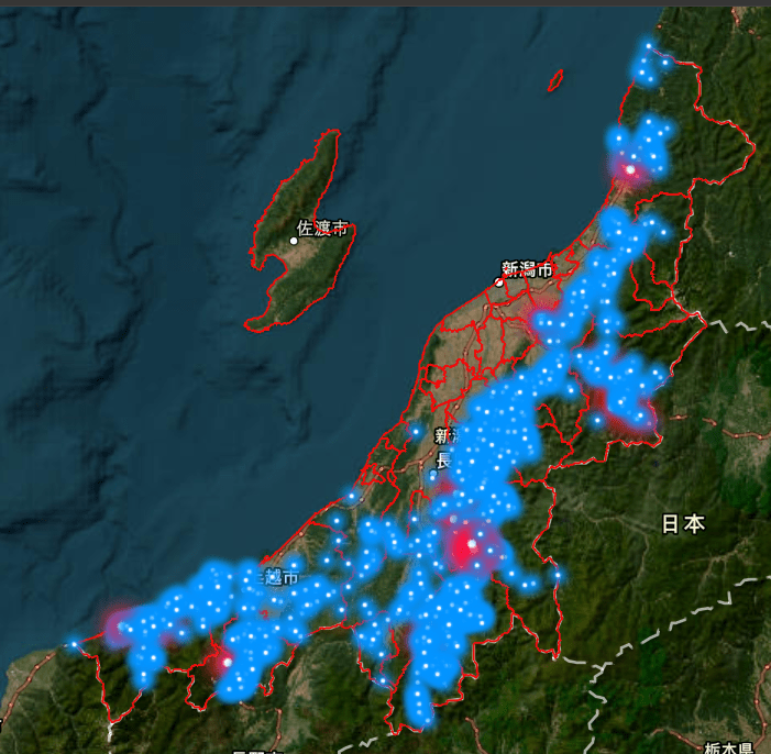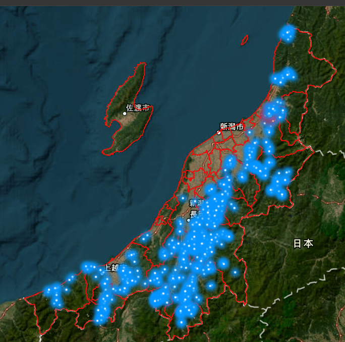 17年から25年の出没地点を比較すると、熊の出没を示す青い点が、内陸の山間部の裾野から平野部へと徐々に広がっていることが分かります。上越地域東部から魚沼地域などで特に拡大しているのが見て取れます。