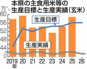 新潟県は25日、2026年産主食用米の目標生産量を56万2千トンにすると公表した。25年産実績(見込み)の58万9千トンから2万7千トン減らす。目標値は国の需要見通しに基づいて算出、コメ不足となった24年産実績の54万4千トンは上回る値とした。また、主食用米の増産で供給不足となっている酒米ともち米について、今回初めて目標生産面積を設定。全用途で「需要に応じたコメ生産」を目指す。