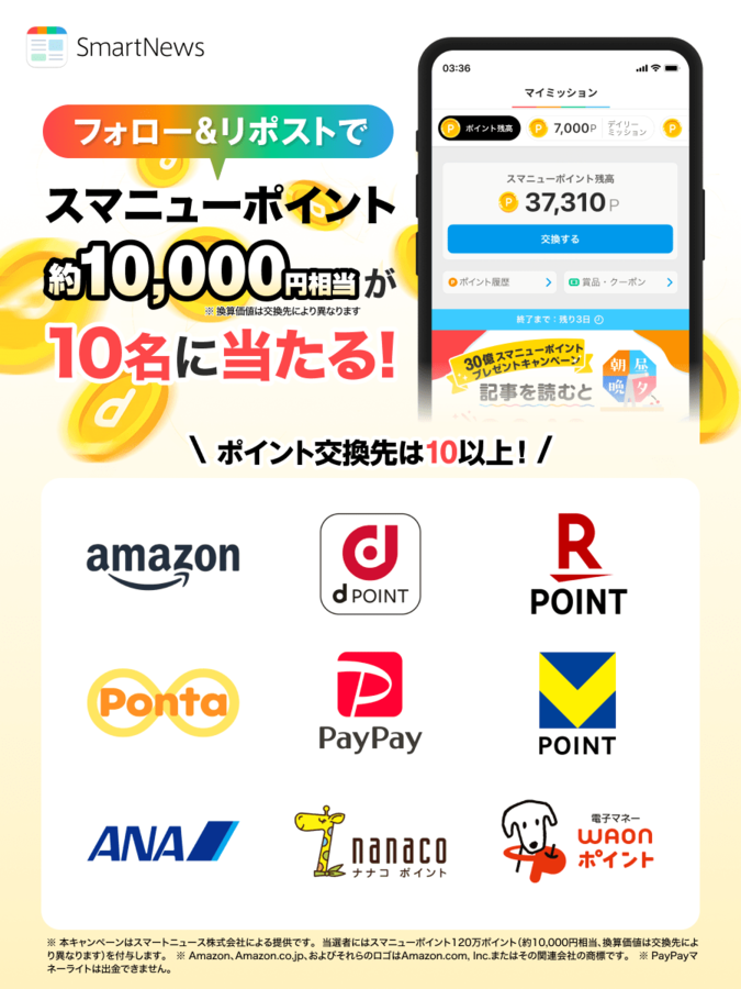 Xのスマートニュース公式アカウントをフォロー&該当のポストをリポストした方から抽選で10名に『約1万円相当』(換算価値は交換先により異なります)のスマニューポイントが当たるキャンペーンも同時開催します。詳細は以下のアカウントをご覧ください。